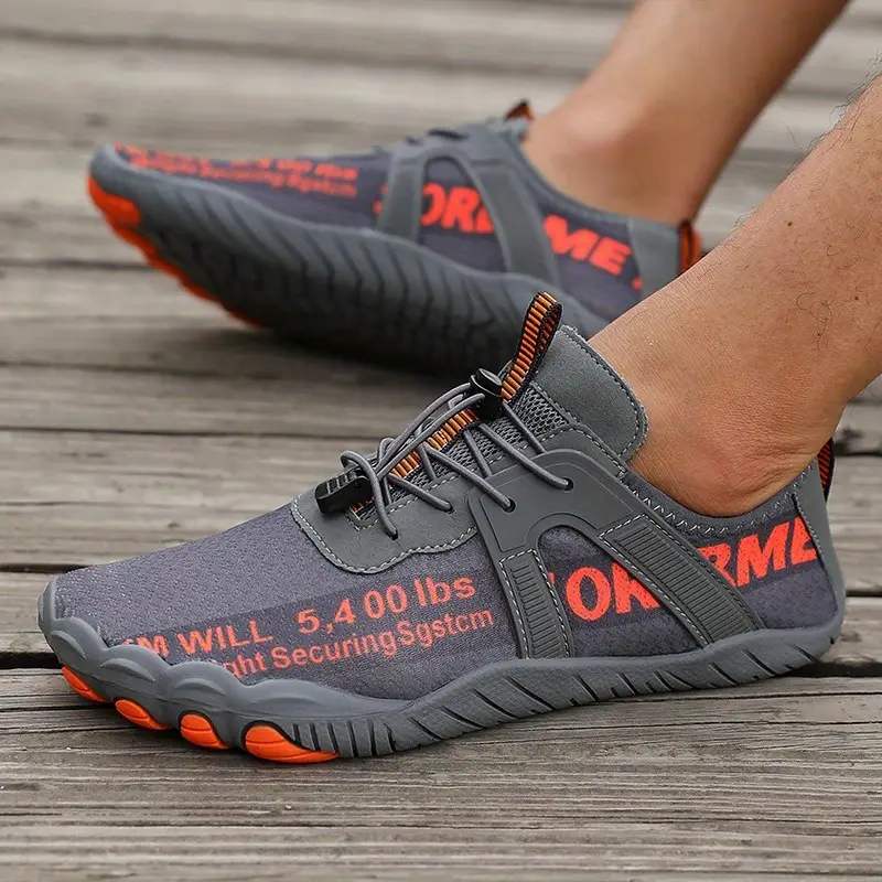 يتميز الحذاء بلونه الرمادي الأنيق مع لمسات برتقالية جريئة تضيف لمسة حيوية وعصرية. الجزء العلوي مصنوع من نسيج شبكي مسامي يضمن تهوية ممتازة ويساعد على تجفيف الحذاء بسرعة بعد الاستخدام في الماء، مما يمنع الشعور بالثقل.